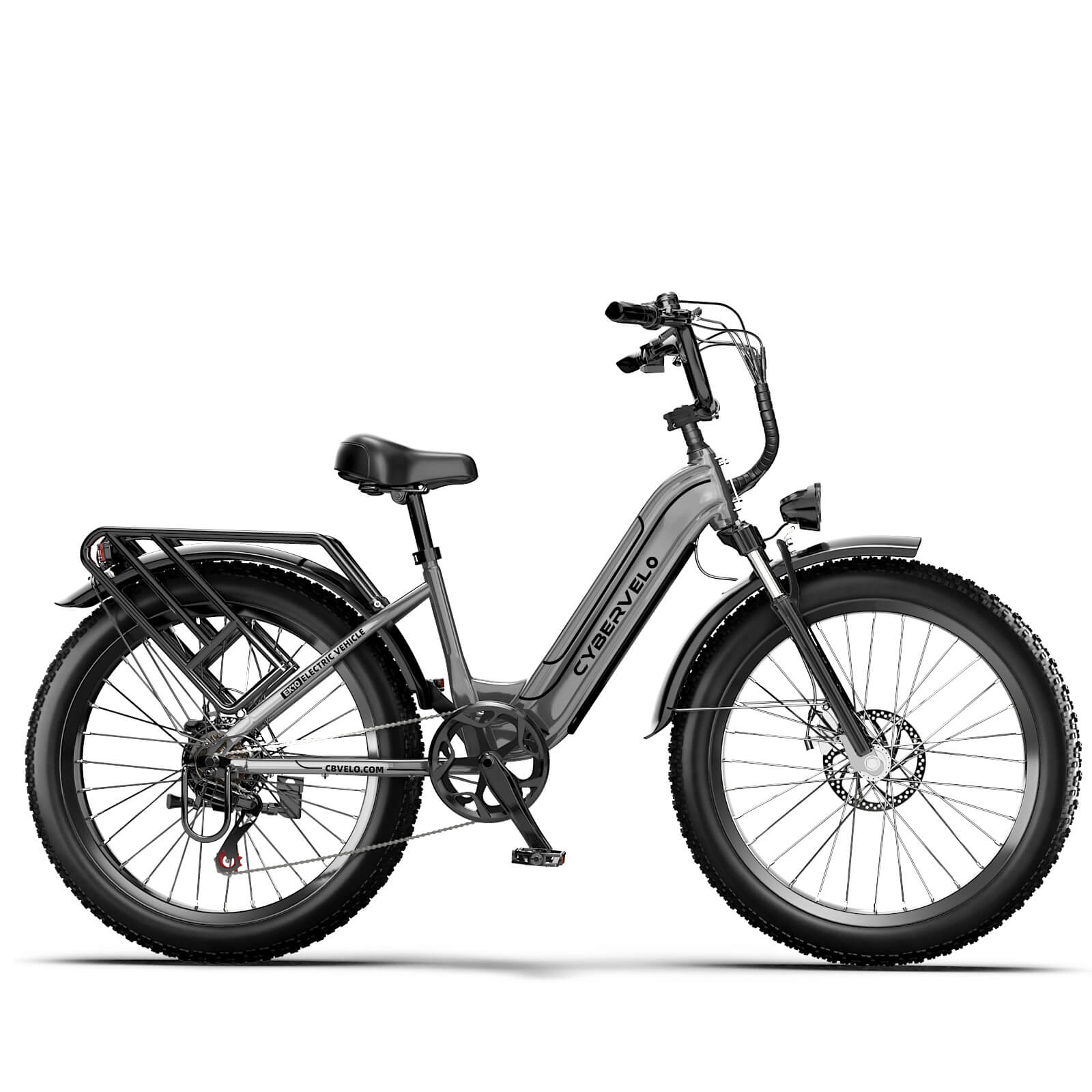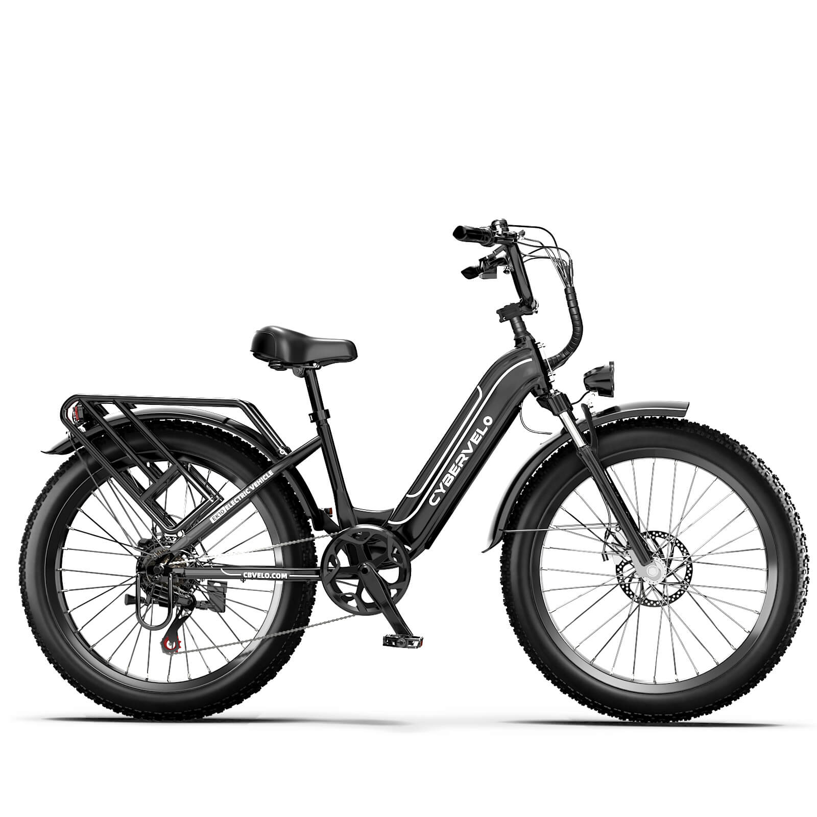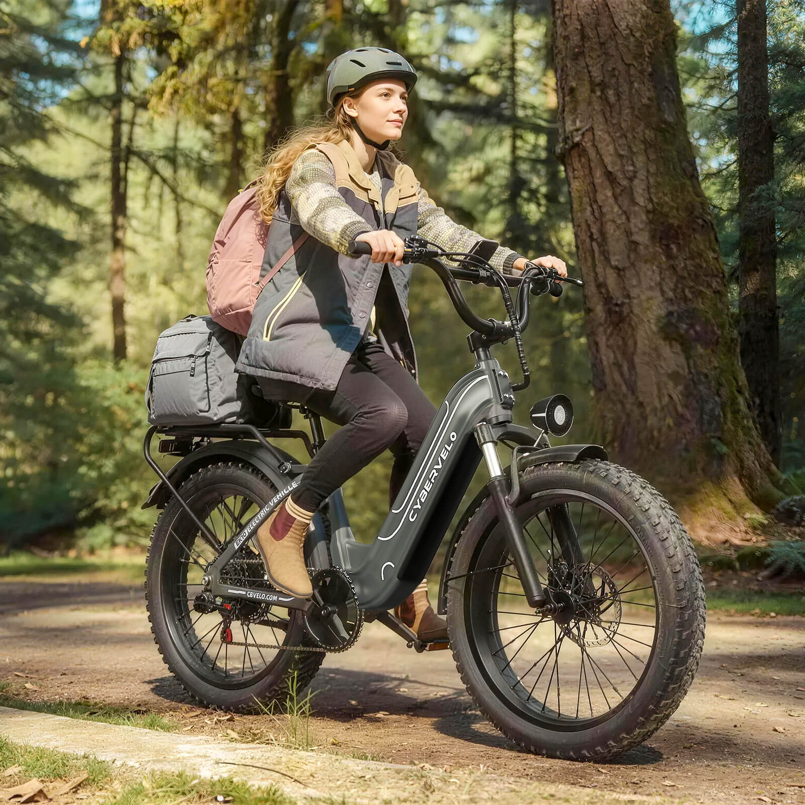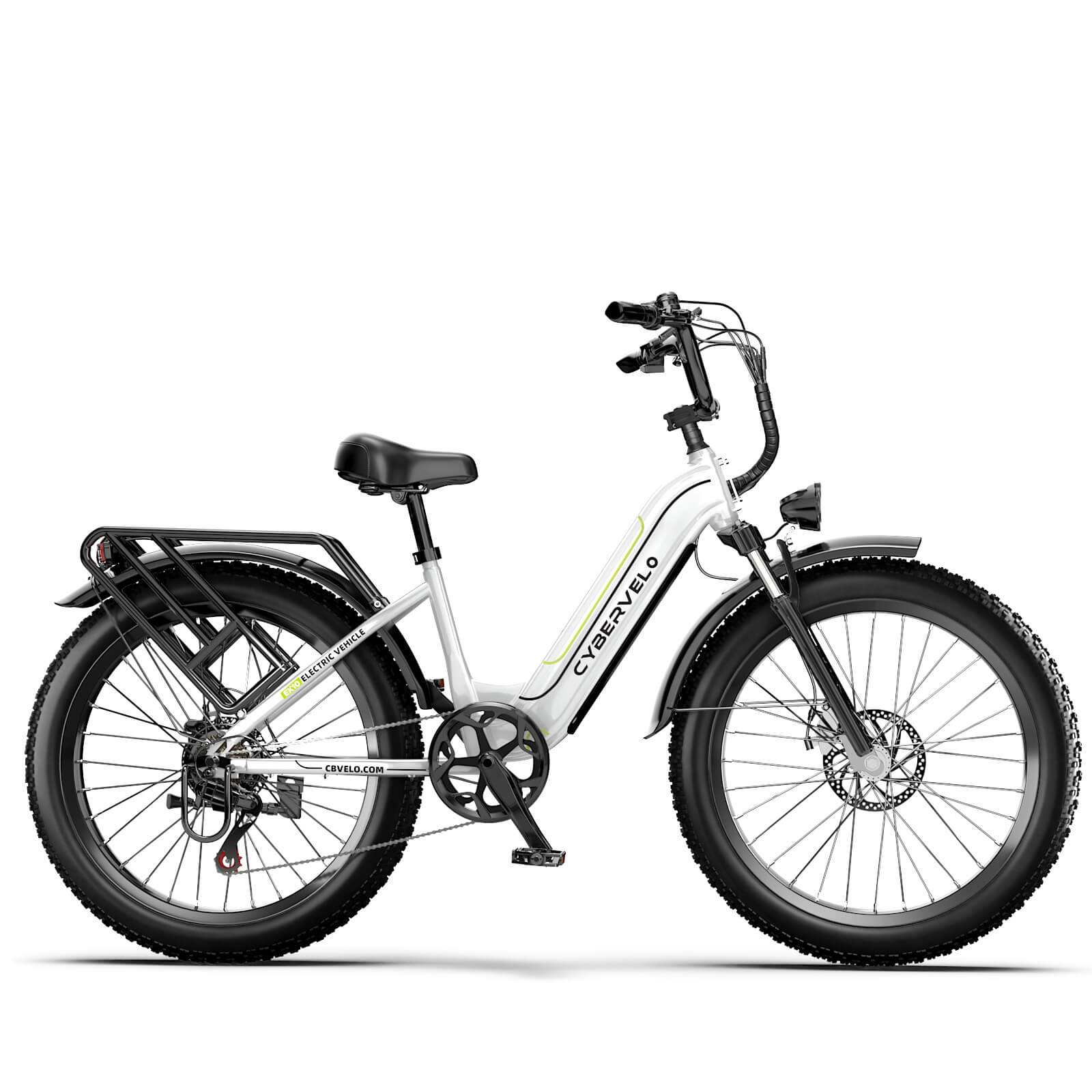 The Cybervelo EK10 features 26”× 4.0” fat tires with wear-resistant and puncture-resistant design, suitable for all-terrain and off-road riding.